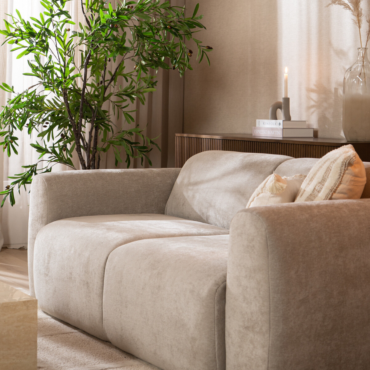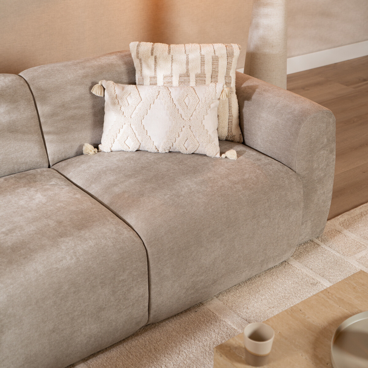 De zachte, afgeronde armleuningen nodigen uit tot ontspannen zitten, terwijl de volledig gestoffeerde zitting tot aan de vloer zorgt voor een strakke en luxe uitstraling. De bank heeft een lage rugleuning en een lage zit en is geschikt voor 2 tot 3 personen.