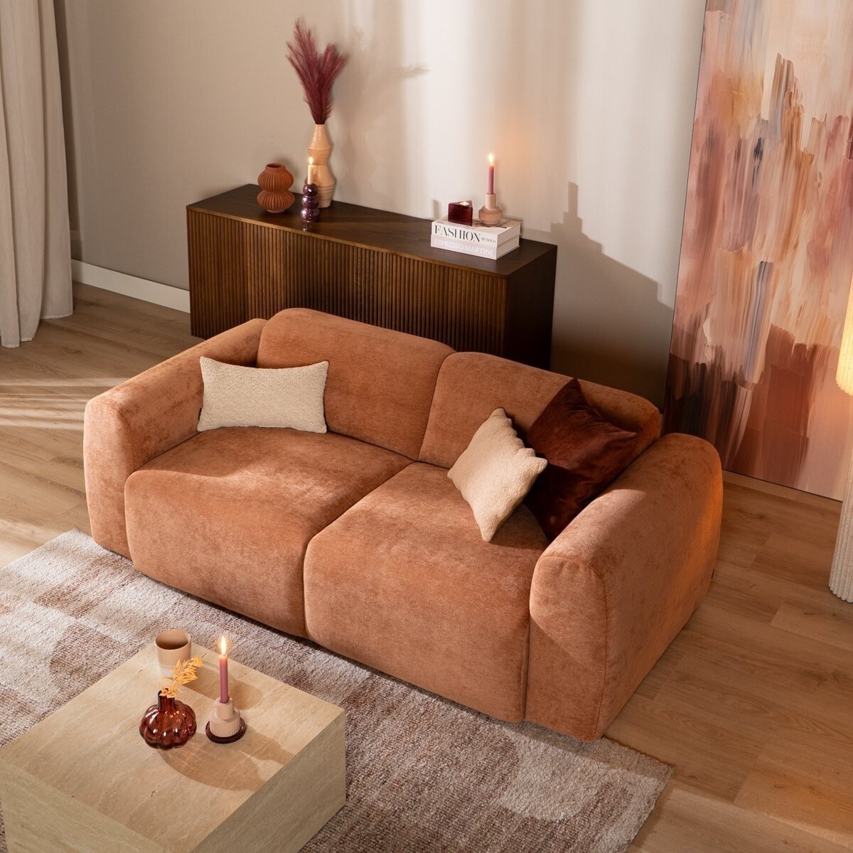 De zachte, afgeronde armleuningen nodigen uit tot ontspannen zitten, terwijl de volledig gestoffeerde zitting tot aan de vloer zorgt voor een strakke en luxe uitstraling. De bank heeft een lage rugleuning en een lage zit en is geschikt voor 2 tot 3 personen.