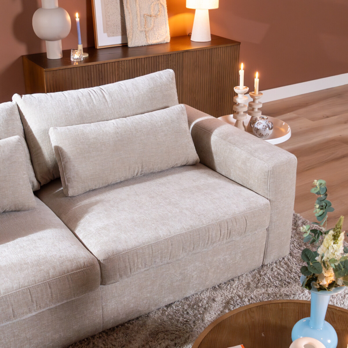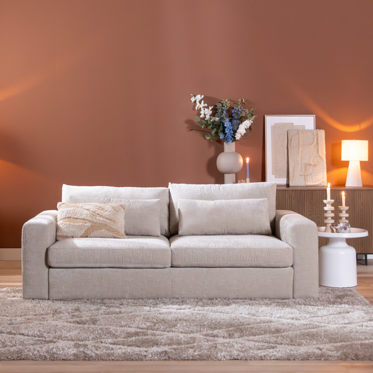 Dankzij de waterafstotende chenille stof is de bank eenvoudig schoon te houden. Dep gemorste vloeistoffen direct met een droge doek, vermijd wrijven of schrobben om de stof te beschermen. Wekelijks stofzuigen met een zachte meubelborstel houdt het materiaal fris en mooi. Voor diepere reiniging adviseren wij het gebruik van onze Textiel Care Kit voor het beste resultaat en langdurig behoud van de stof.