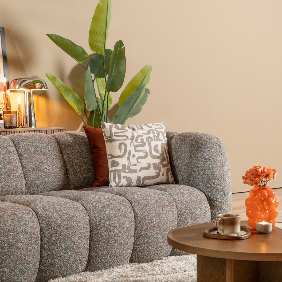 De 3-zitsbank Luca is bekleed met onze exclusieve bouclé stof, ook wel bekend als Trivello. Bouclé staat bekend om zijn lusvormige, geraffineerde structuur die niet alleen aangenaam zacht aanvoelt, maar ook een warme, uitnodigende look creëert. De stof bestaat uit 100% polyester en heeft een Martindale-score van 60.000, wat betekent dat deze bijzonder slijtvast is en perfect geschikt voor intensief dagelijks gebruik. Het onderstel van de bank is afgewerkt in zwart, wat een subtiel contrast geeft en zorgt voor modern karakter.