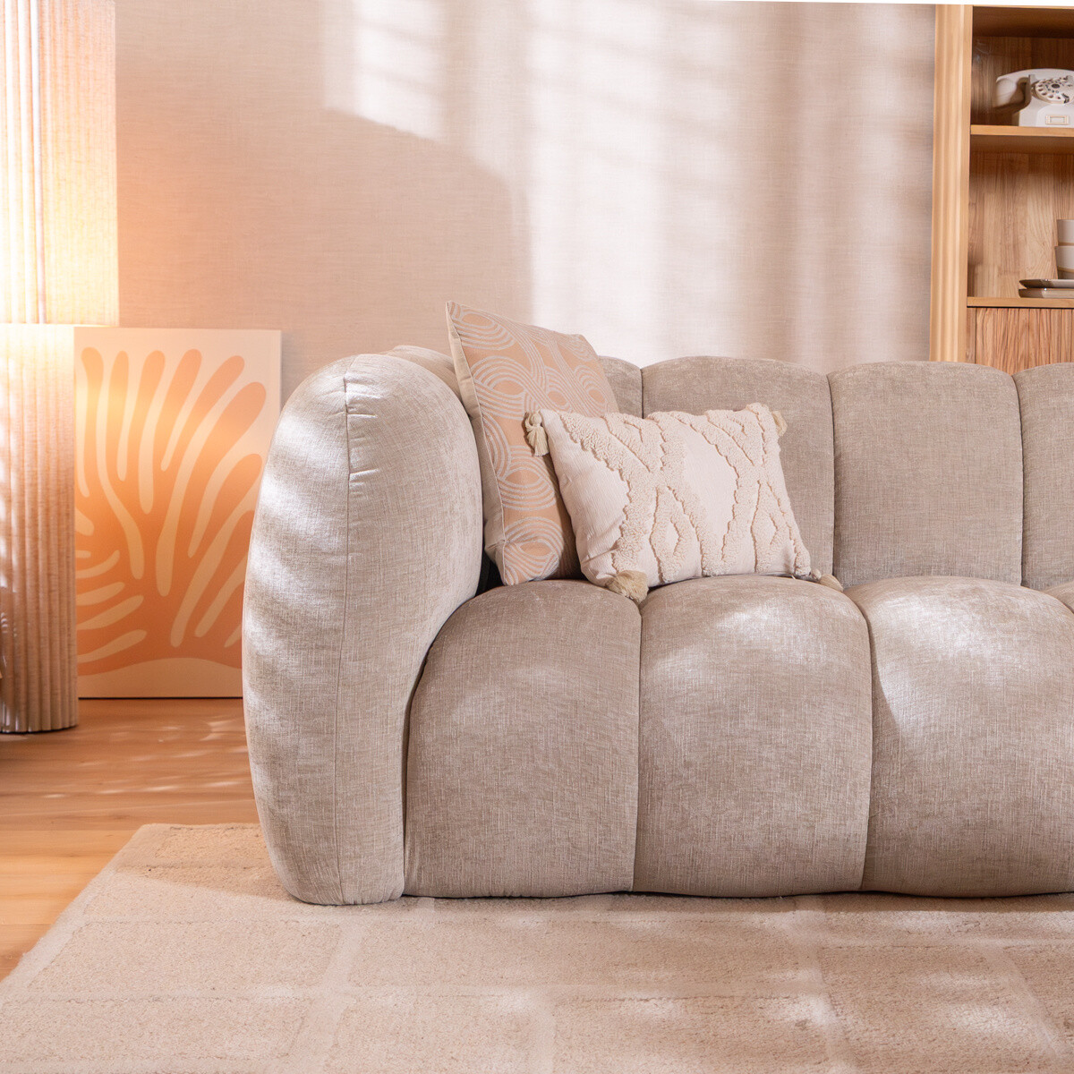 De Luca bank is bekleed met onze Eddy-stof, een hoogwaardige chenille stof die bestaat uit 100% polyester. Deze duurzame stof kenmerkt zich door een volle, rijke structuur die zacht aanvoelt én waterafstotend is. De Martindale-score van 60.000 toont aan dat de bekleding extreem slijtvast is en uitstekend bestand tegen intensief dagelijks gebruik. De zachte rondingen van de bank in combinatie met de gestreepte structuur geven het geheel een speelse en uitnodigende uitstraling.
