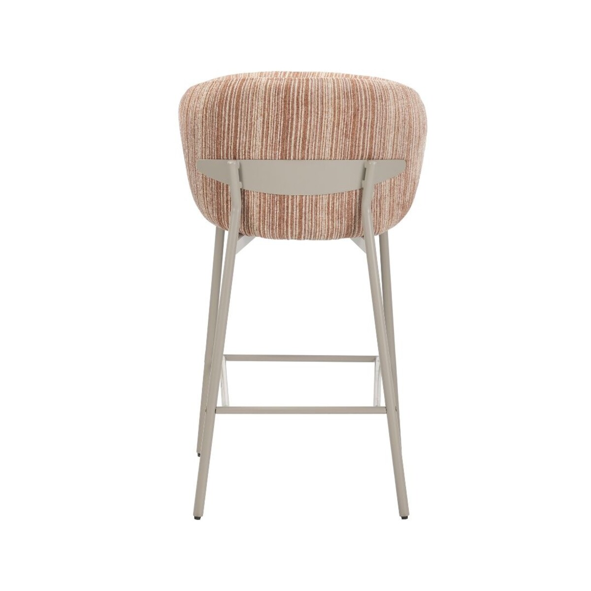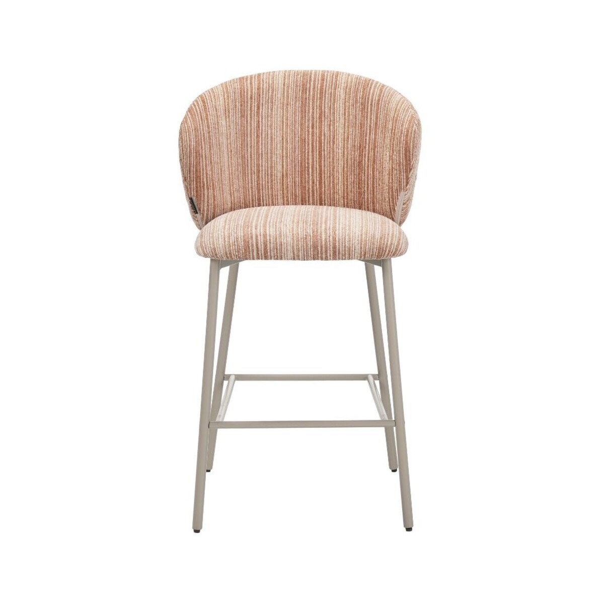 De barkruk is bekleed met een zachte, slijtvaste chenille stof met een subtiel gestreept oppervlak dat vlekken en gebruikssporen moeiteloos camoufleert. Het frame is van stevig metaal en heeft een elegante, beige afwerking, wat niet alleen stabiliteit biedt, maar ook een moderne touch geeft. Dankzij het compacte ontwerp zonder armleuningen is de kruk ruimtebesparend en schuif je hem eenvoudig onder het keukenblad of de bar wanneer hij niet in gebruik is. Voor optimaal zitcomfort adviseren we 20 tot 25 cm ruimte tussen de zithoogte en het tafelblad.