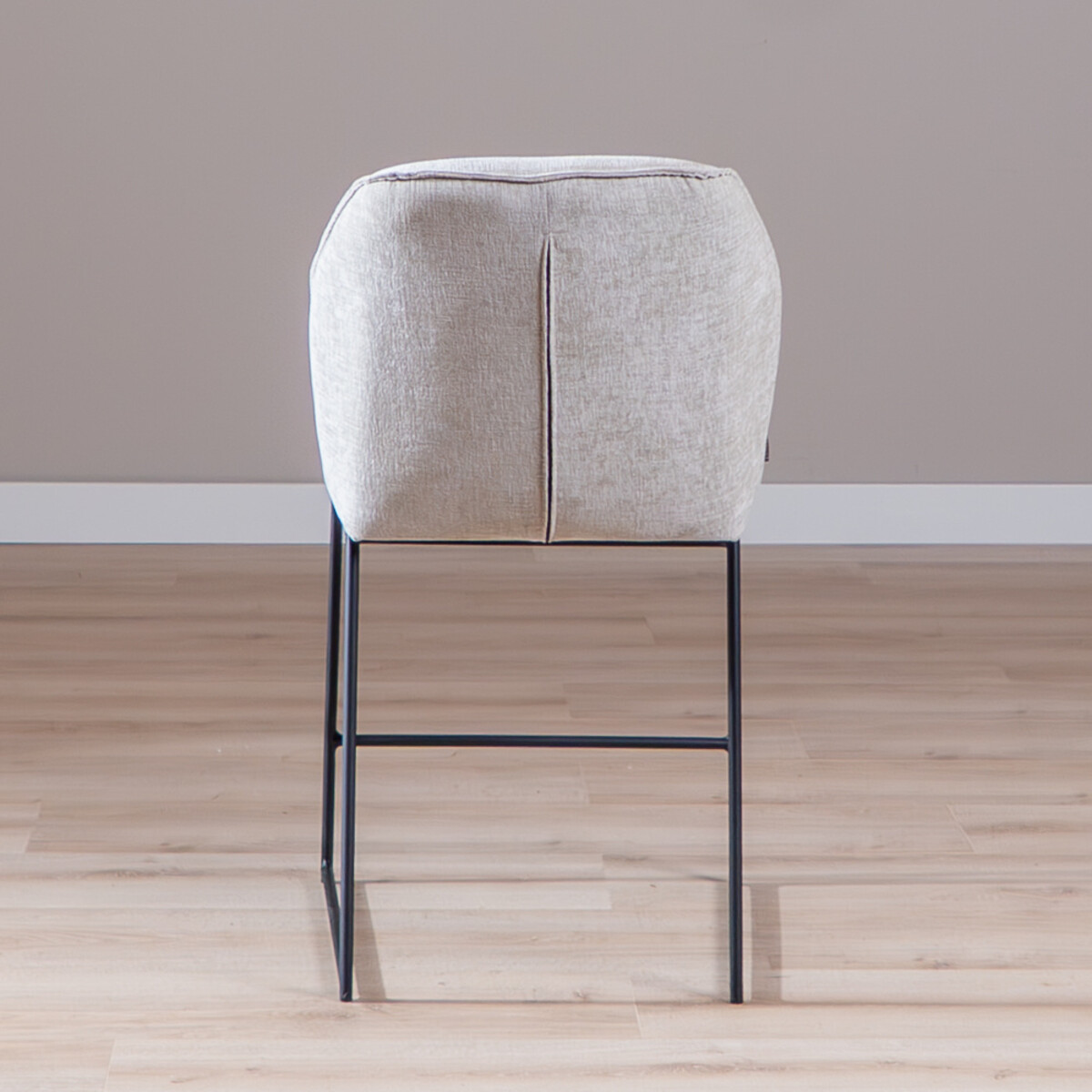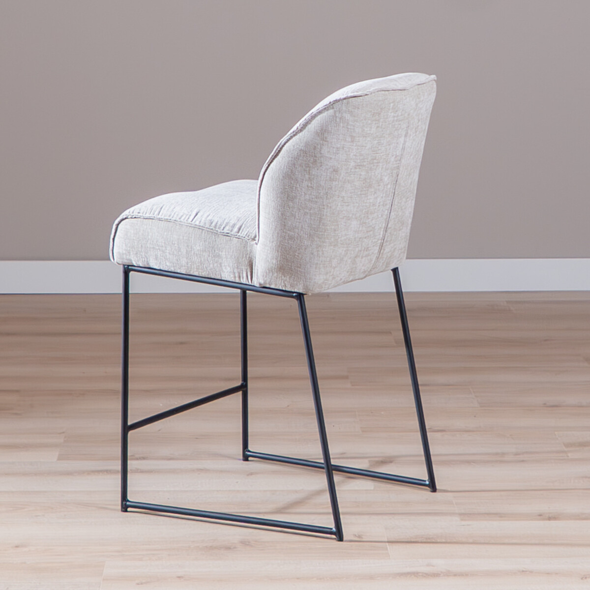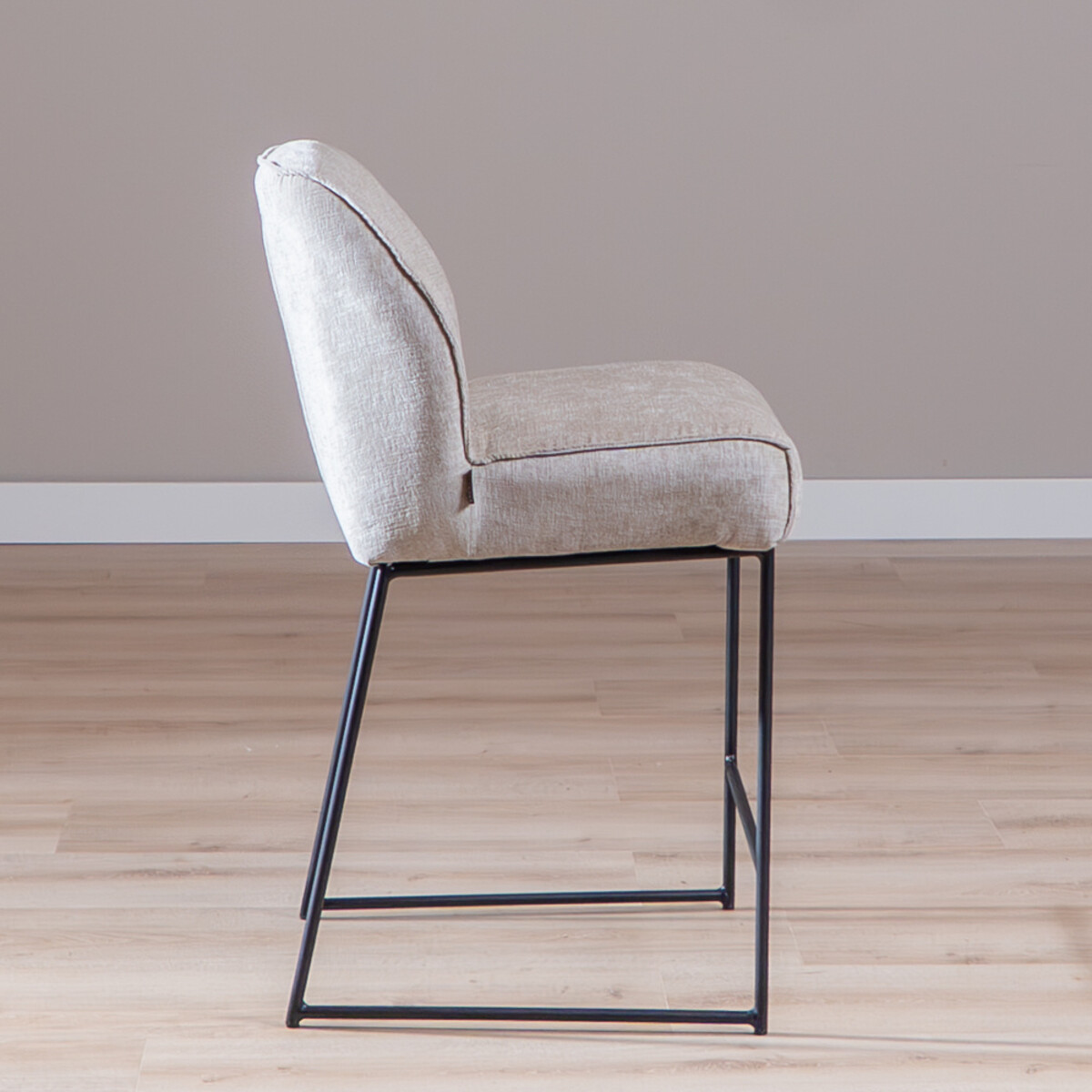 Deze barkruk is voorzien van een luxe chenille stof die bekend staat om zijn zachte touch en duurzaamheid. Dankzij de waterafstotende eigenschappen blijft de stof langer mooi. De nosag veringen in de zitting bieden een uiterst hoog zitcomfort, waardoor lang zitten geen enkel probleem is. Voor het beste comfort wordt geadviseerd een afstand van 20 tot 25 cm te houden tussen de zithoogte en de onderzijde van het tafelblad. De zithoogte van de Momo is geschikt voor tafelbladen met een hoogte van 93-98 cm.