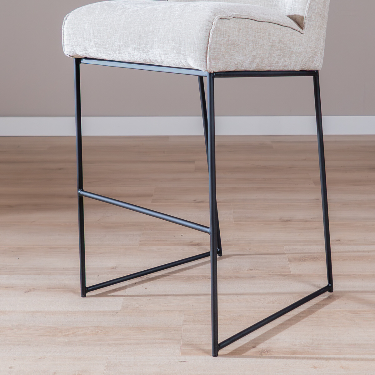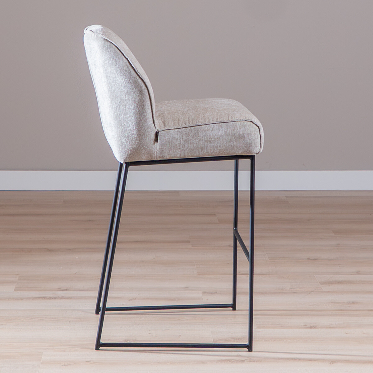 Deze barkruk is voorzien van een luxe chenille stof die bekend staat om zijn zachte touch en duurzaamheid. Dankzij de waterafstotende eigenschappen blijft de stof langer mooi. De nosag veringen in de zitting bieden een uiterst hoog zitcomfort, waardoor lang zitten geen enkel probleem is. Voor het beste comfort wordt geadviseerd een afstand van 20 tot 25 cm te houden tussen de zithoogte en de onderzijde van het tafelblad. De zithoogte van de Momo is geschikt voor tafelbladen met een hoogte van 105-110 cm.