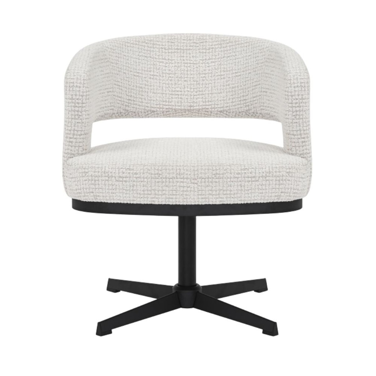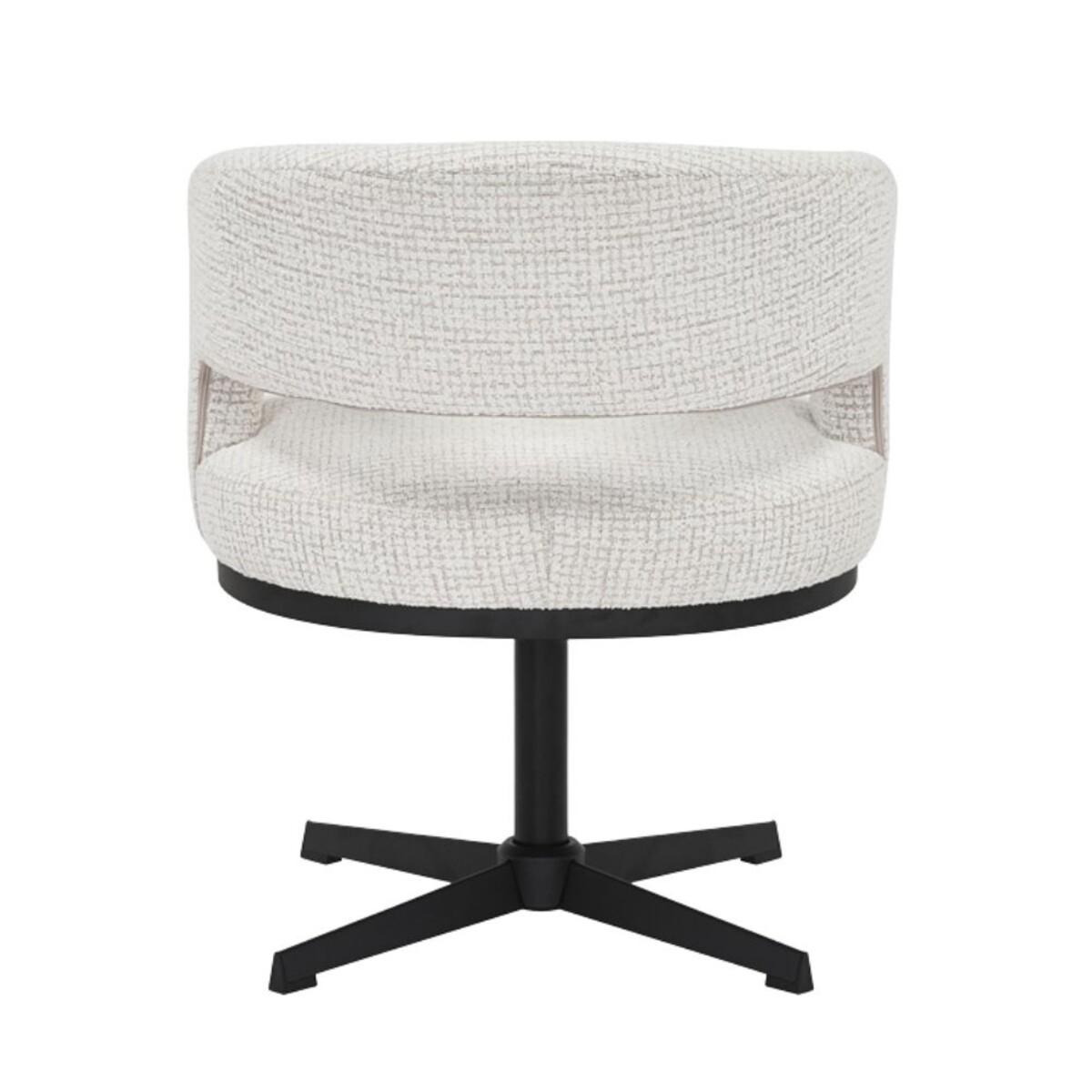 Draaifauteuil Gino combineert een compact formaat met hoog zitcomfort. De gemêleerde beige stoffering en de zachte, ronde belijning geven de fauteuil een eigentijdse en sfeervolle uitstraling. Het zwarte onderstel met draaifunctie voegt niet alleen functionaliteit toe, maar ook een modern accent.