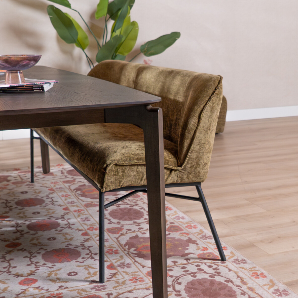 De Momo eetkamerbank past perfect binnen een Urban interieur. De olijfgroene chenille stof geeft een warme en trendy uitstraling, terwijl de bank door de stevige nosag vering in de zitting langdurig comfort garandeert. Combineer de bank eenvoudig met de andere Momo kruk of stoel voor een samenhangend geheel aan je eettafel. Meet de afstand tussen de tafelpoten goed op, zo weet je zeker dat de bank hier tussen past.