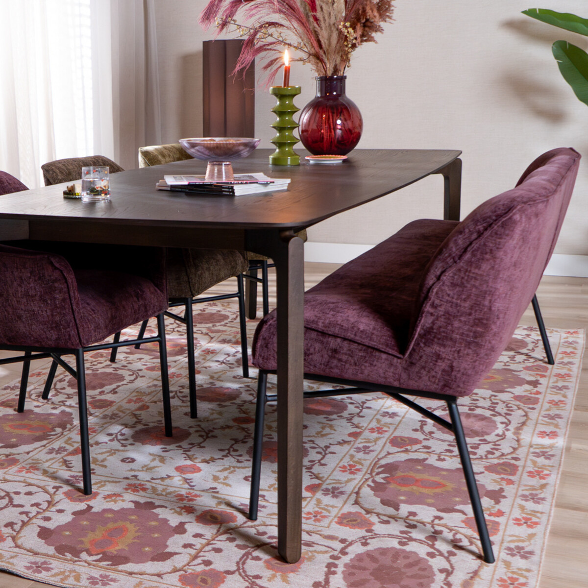 Maak kennis met de Eetkamerbank Momo chenille paars 185 cm. Deze bank valt op door de opvallende kleur en biedt comfortabel plaats aan 3 tot 4 personen. Door het unieke design en de hoogwaardige chenille stof is het een echte blikvanger in je interieur en uitermate geschikt voor wie zoekt naar functionaliteit en uitstraling. Meet de afstand tussen de tafelpoten goed op, zo weet je zeker dat de bank hier tussen past.