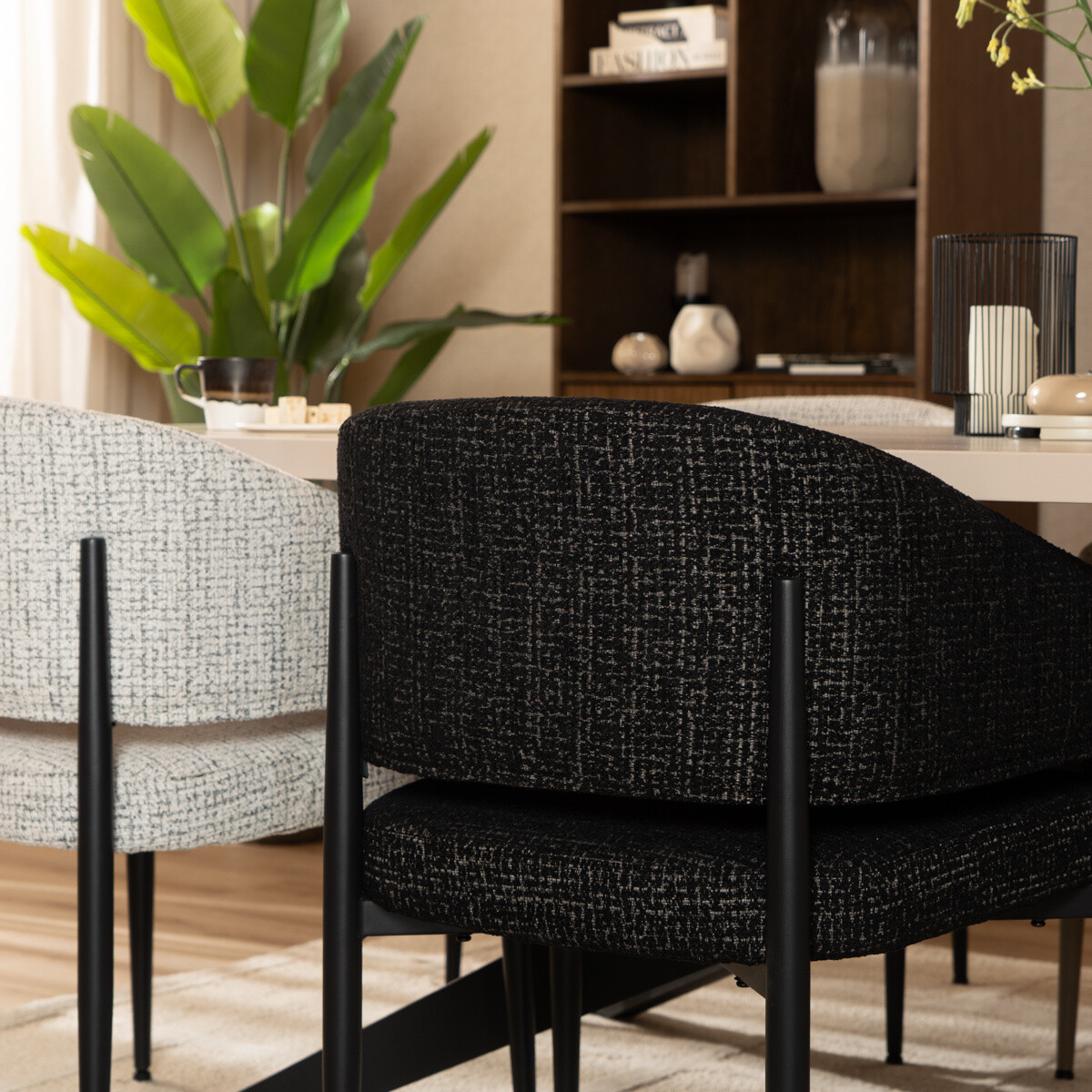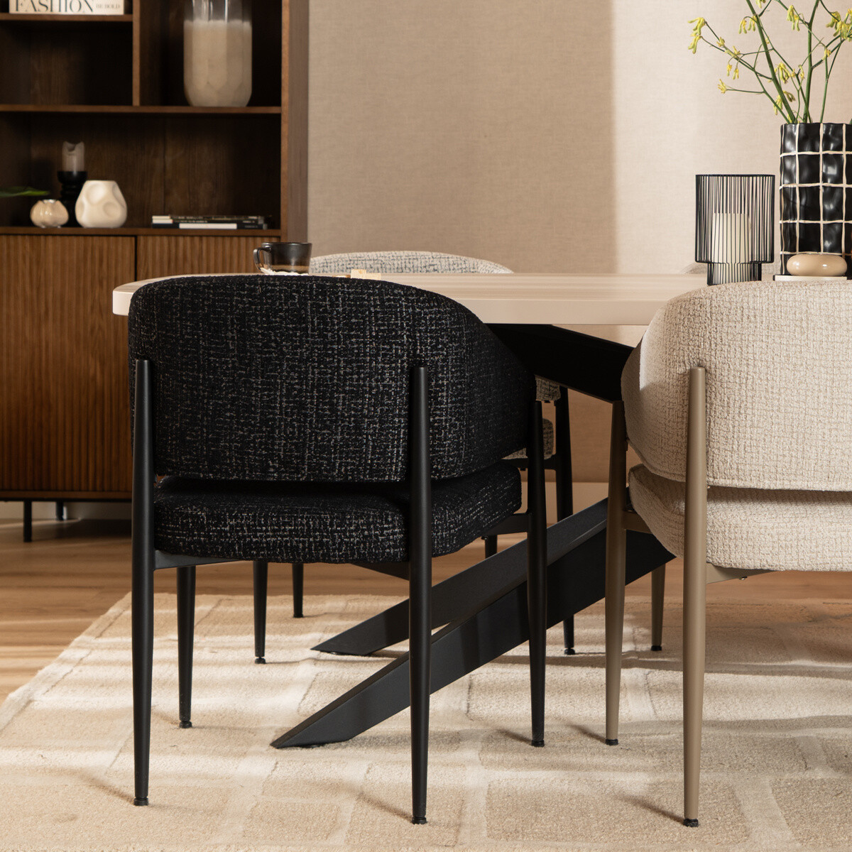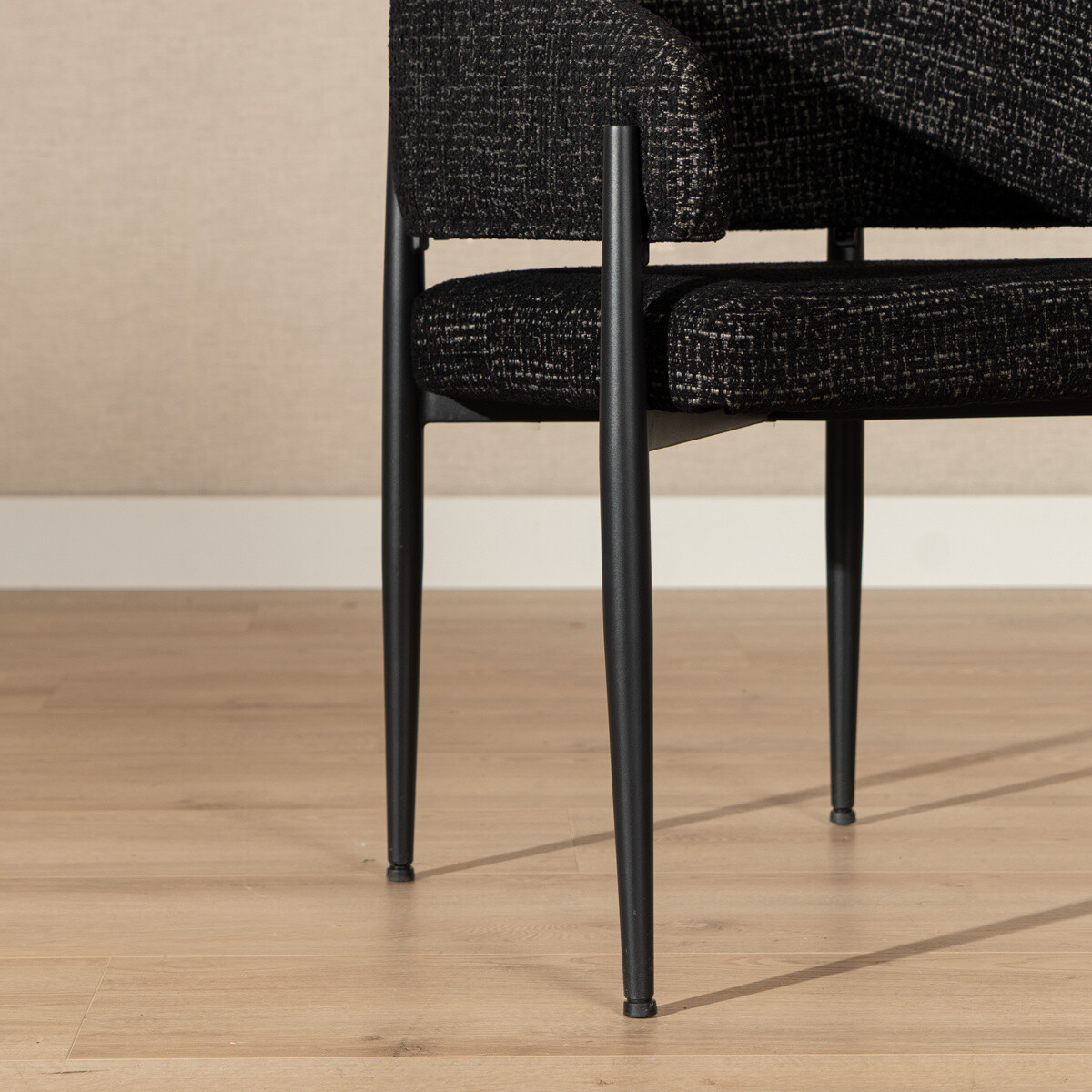 Eetkamerstoel Armin heeft door het zwarte frame in combinatie met de gemêleerde stof een exclusieve, stijlvolle uitstraling.