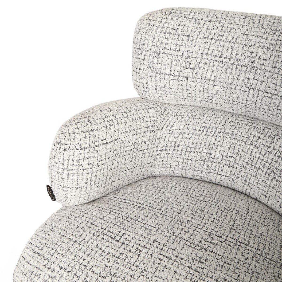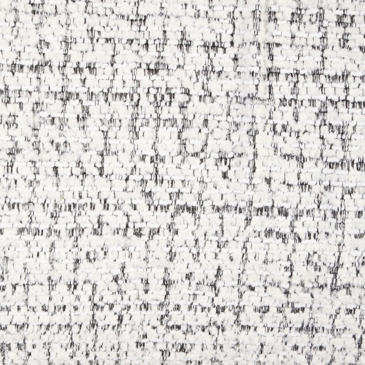De stoel is uitgevoerd in een gemêleerde stof, geweven met twee kleuren garen die subtiel met elkaar zijn vermengd. Dit geeft de bekleding een subtiel ruitpatroon en een verfijnde, luxe uitstraling.