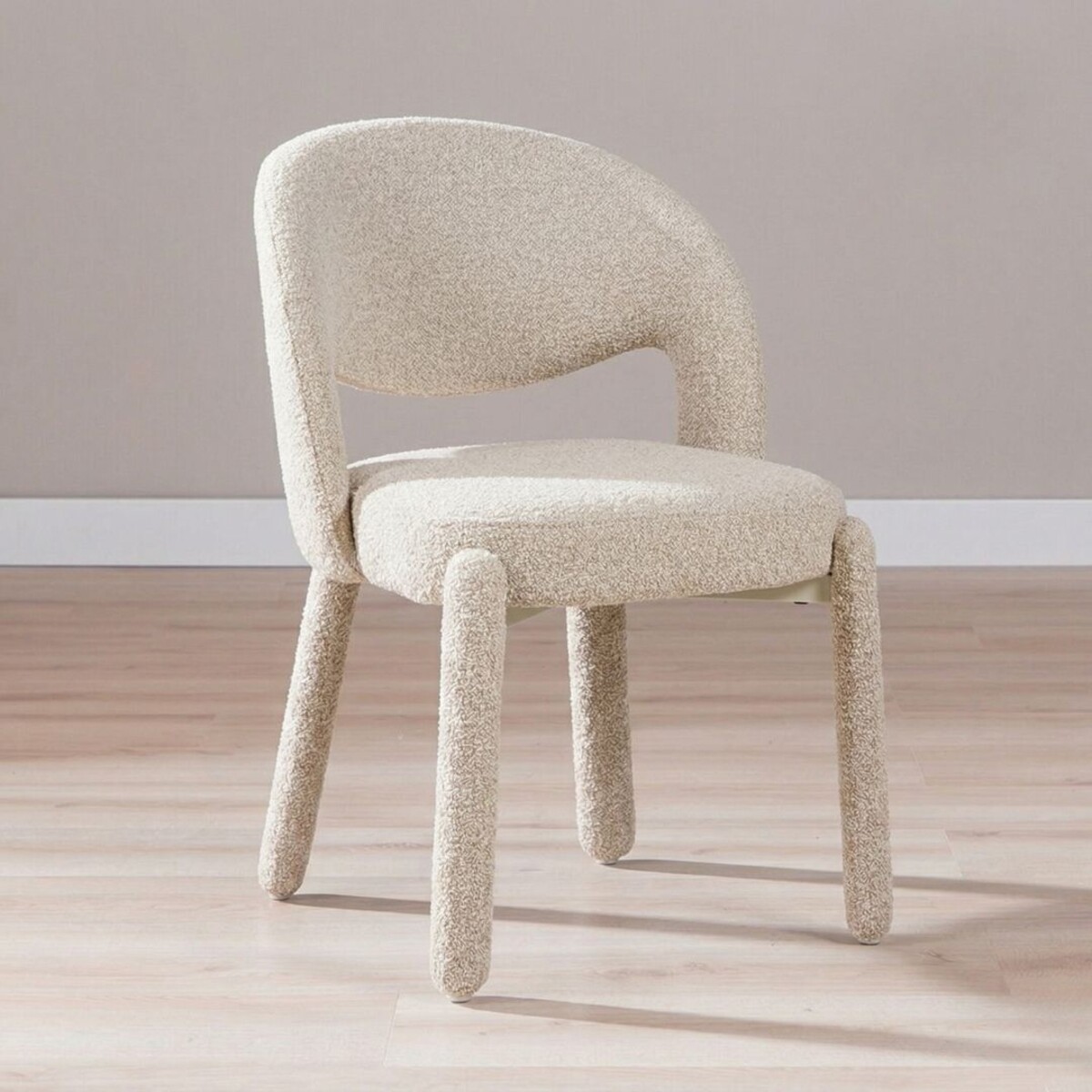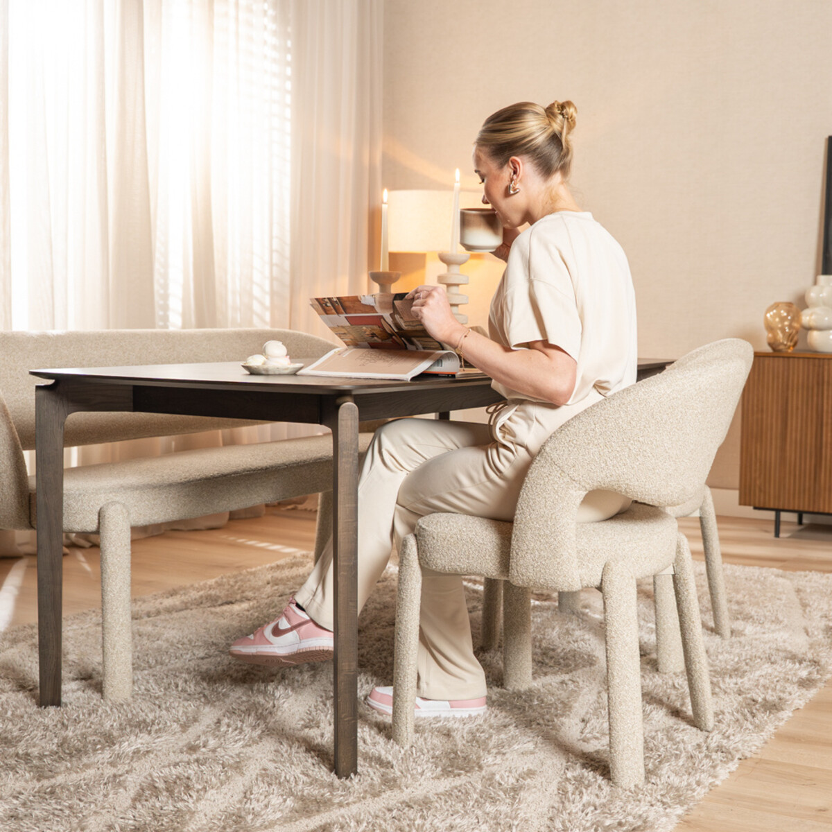 De bekleding van de eetkamerstoel bestaat uit een hoogwaardige bouclé stof met een gemêleerde draad, wat zorgt voor een rijke textuur en een moderne uitstraling. De doorgestoffeerde poten en het stevige ijzeren frame zorgen voor stabiliteit en een stijlvolle uitstraling. De stof is zeer slijtvast en daarmee geschikt voor intensief gebruik door het hele gezin.