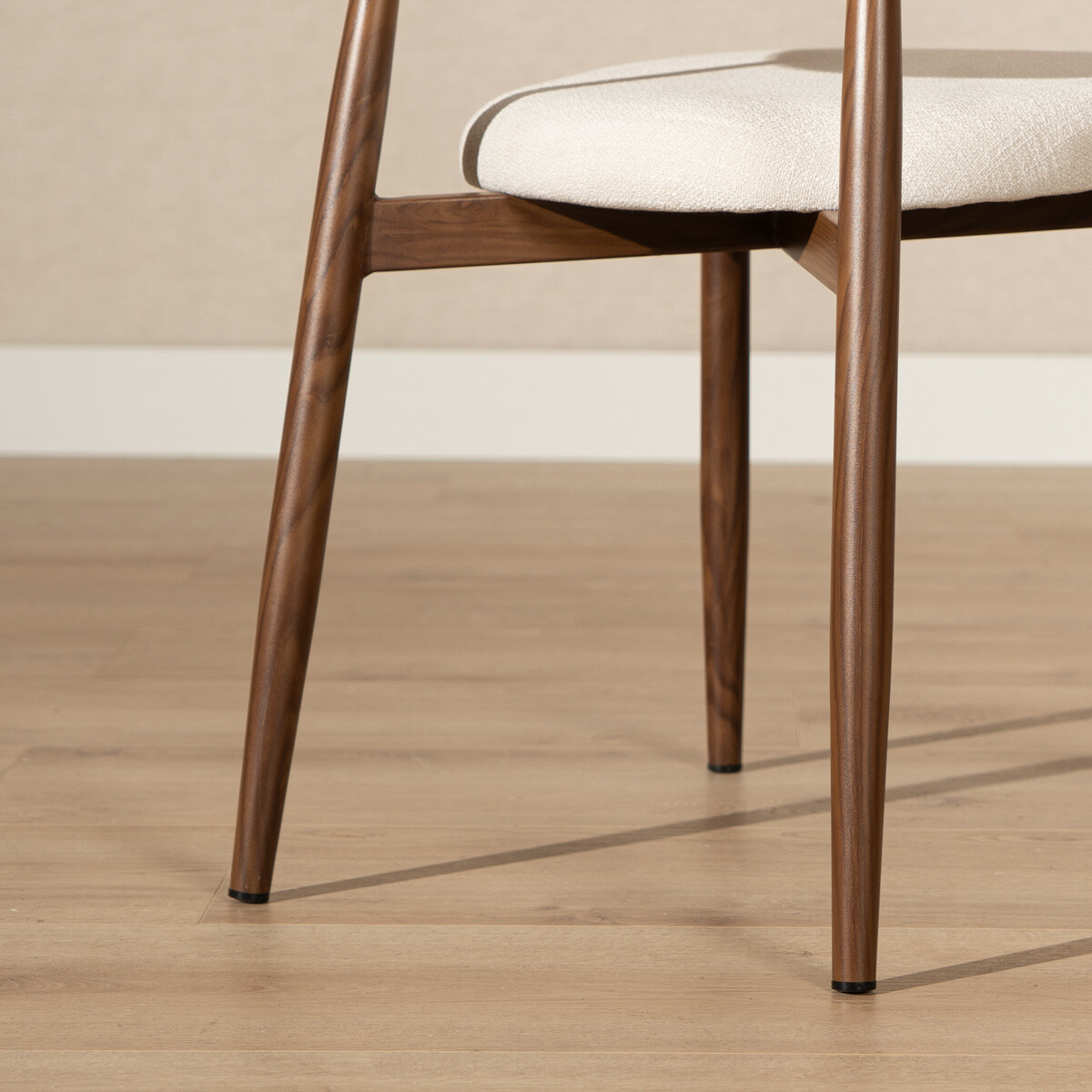 Het onderstel heeft een warme houtlook, maar is gemaakt van stevig metaal – voor een stabiele en solide basis met een natuurlijke uitstraling. De zithoogte van 47 cm zorgt voor een prettige, rechte zitpositie aan de eettafel.