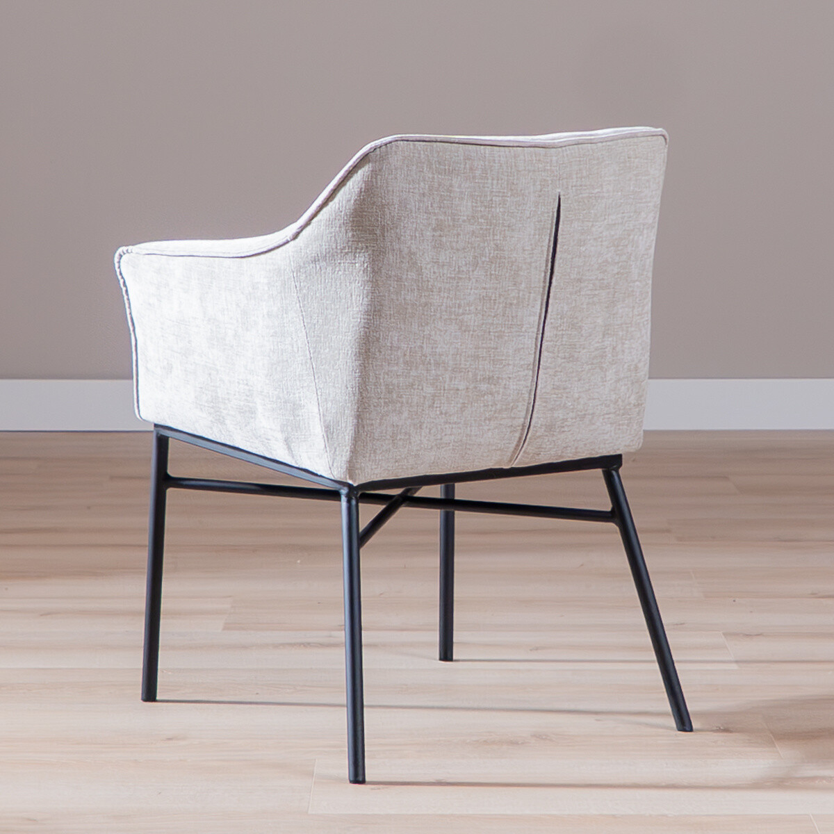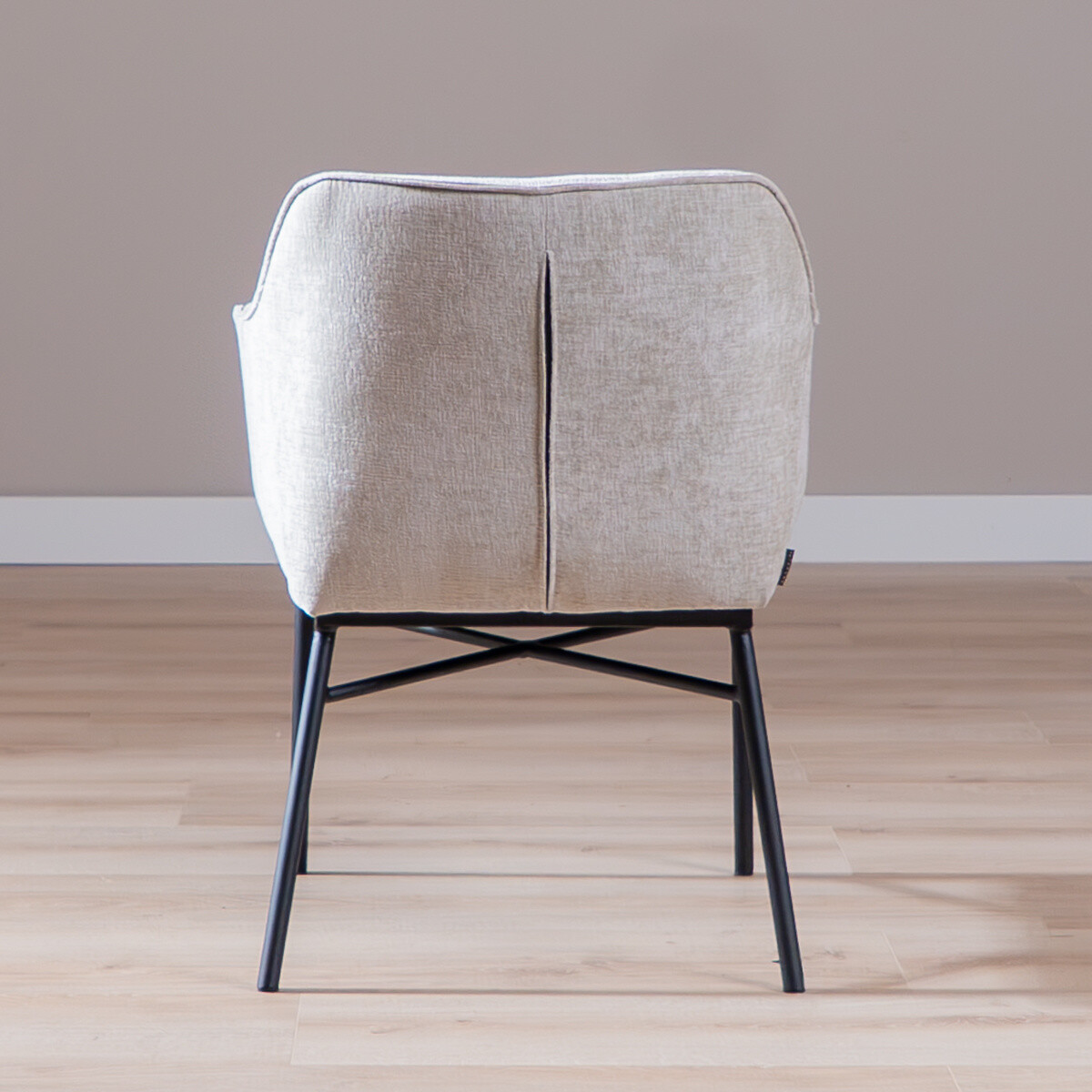 Deze stoel heeft een frame van extra verstevigd metaal en een zitting met nosag vering, wat resulteert in een optimaal zitcomfort. De water- en vuilafstotende chenille stof is slijtvast en eenvoudig schoon te maken met een vochtige doek. Door de rijkgevulde armleuningen en de hoogwaardige afwerking geeft de Nubo direct sfeer aan de eetkamer.