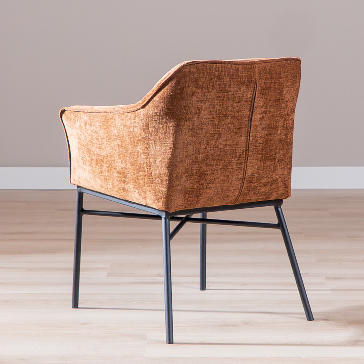 Deze stoel heeft een frame van extra verstevigd metaal en een zitting met nosag vering, wat resulteert in een optimaal zitcomfort. De water- en vuilafstotende chenille stof is slijtvast en eenvoudig schoon te maken met een vochtige doek. Door de rijkgevulde armleuningen en de hoogwaardige afwerking geeft de Nubo direct sfeer aan de eetkamer.