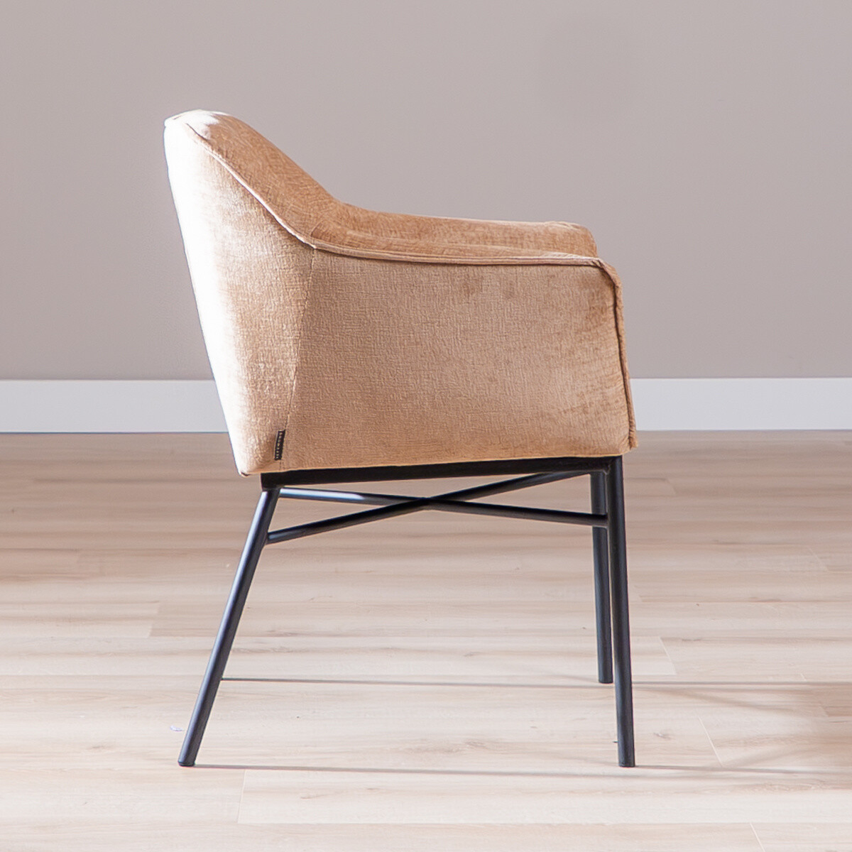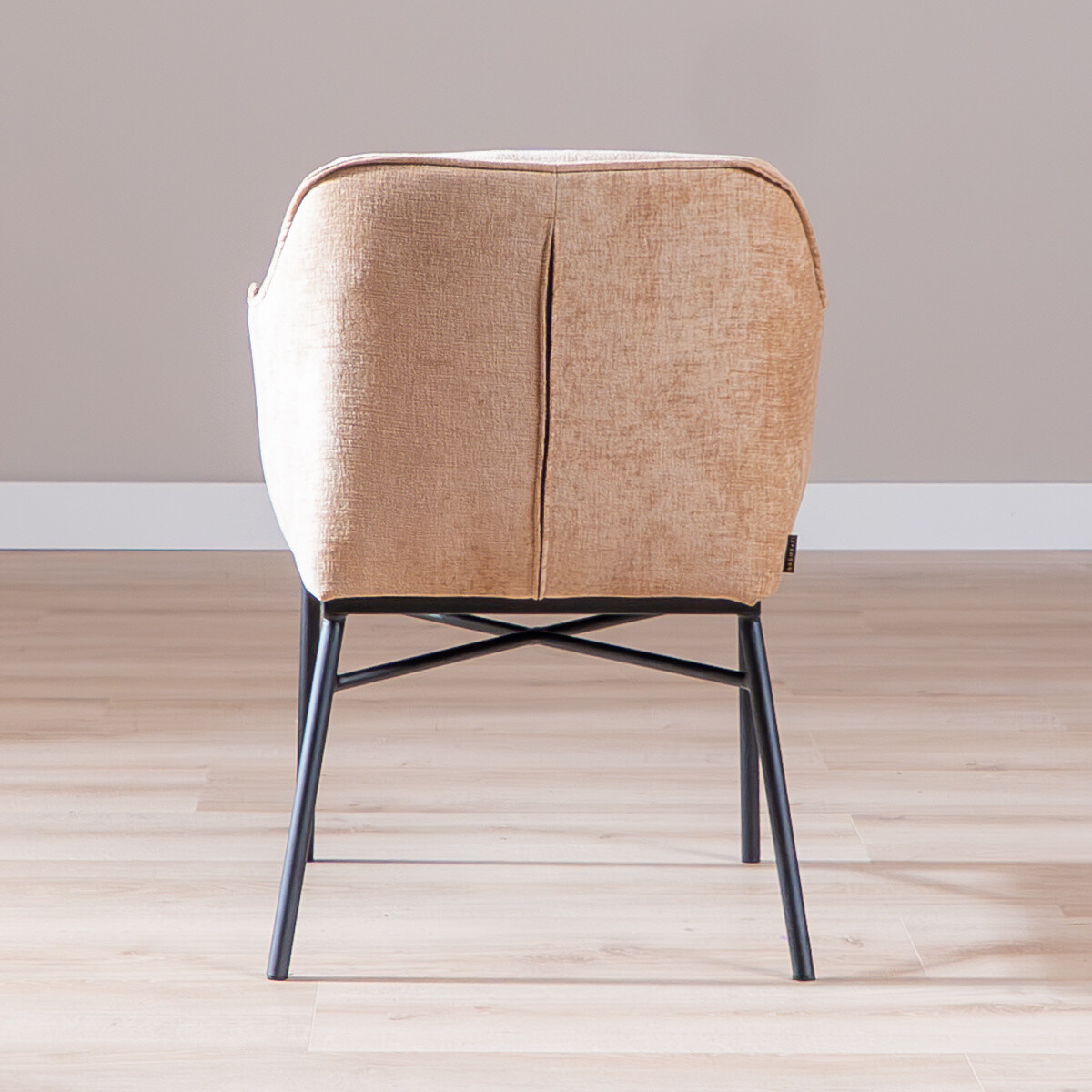 Deze stoel heeft een frame van extra verstevigd metaal en een zitting met nosag vering, wat resulteert in een optimaal zitcomfort. De water- en vuilafstotende chenille stof is slijtvast en eenvoudig schoon te maken met een vochtige doek. Door de rijkgevulde armleuningen en de hoogwaardige afwerking geeft de Nubo direct sfeer aan de eetkamer.