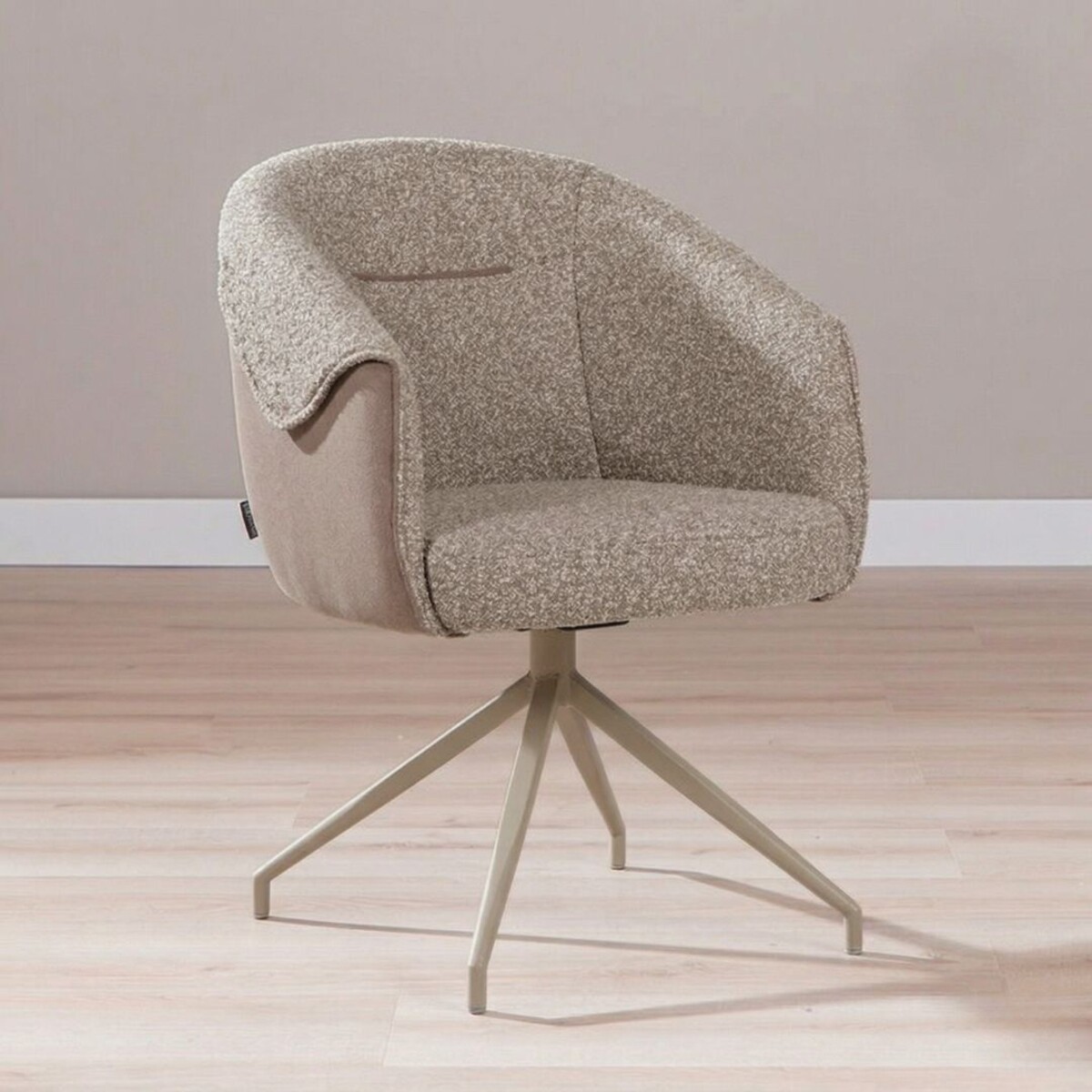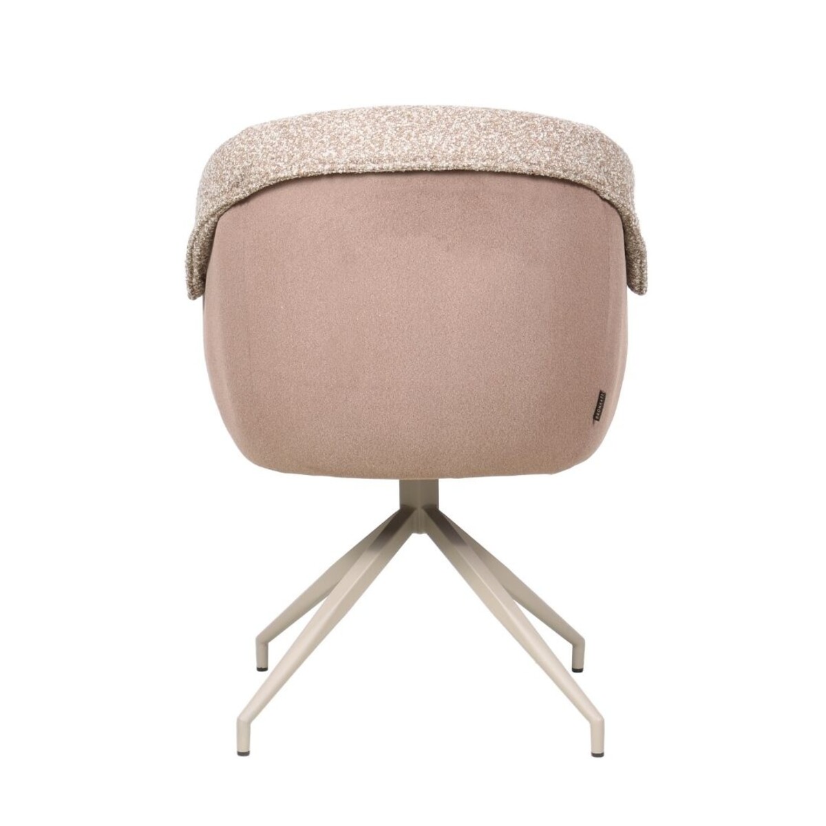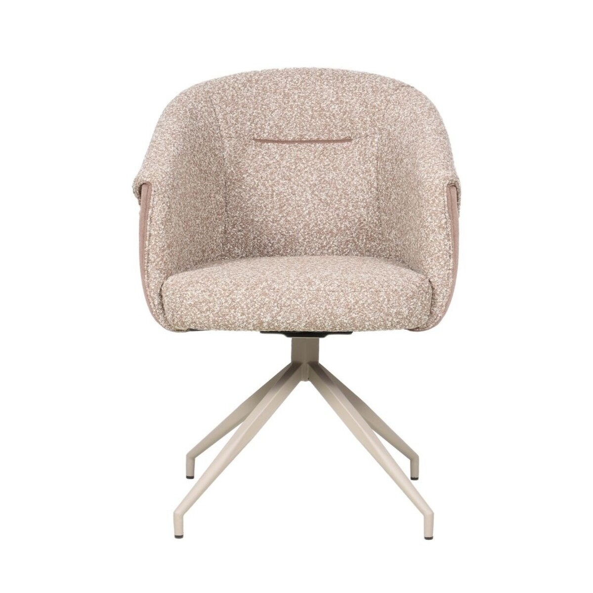De stoel is bekleed met een hoogwaardige bouclé stof met gemêleerde structuur, wat zorgt voor een slijtvast karakter en een speelse, rijke uitstraling. De afwerking met stof aan zowel de voor- als achterzijde van de rugleuning geeft de stoel een verzorgd en luxe geheel. Het metalen frame is tone in tone gekleurd in dezelfde tint als de stoffering, wat zorgt voor een rustige en harmonieuze uitstraling aan tafel. Het stevige metalen onderstel biedt stabiliteit, terwijl het lichte gewicht de stoel eenvoudig verplaatsbaar maakt.