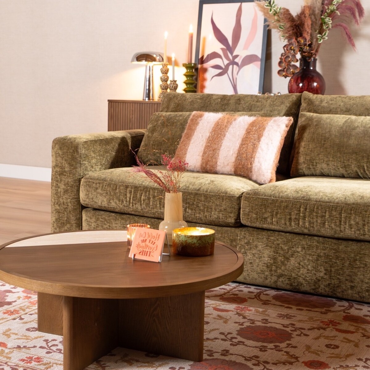Dankzij de waterafstotende chenille stof is de bank eenvoudig schoon te houden. Dep gemorste vloeistoffen direct met een droge doek, vermijd wrijven of schrobben om de stof te beschermen. Wekelijks stofzuigen met een zachte meubelborstel houdt het materiaal fris en mooi. Voor diepere reiniging adviseren wij het gebruik van onze Textiel Care Kit voor het beste resultaat en langdurig behoud van de stof.
