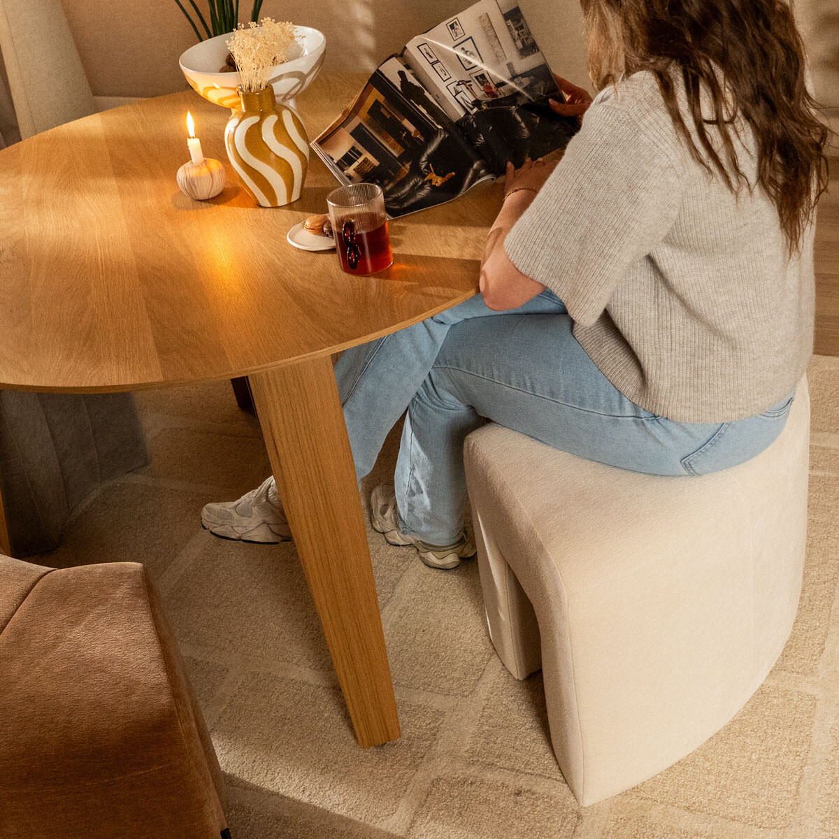 De hocker is bekleed met een duurzame, vuil- en waterafstotende stof. Dankzij deze praktische eigenschappen is de hoek Seth eenvoudig schoon te maken en blijft hij lang mooi, ook bij intensief gebruik. De stof voelt zacht aan en geeft de hocker een verfijnde uitstraling.