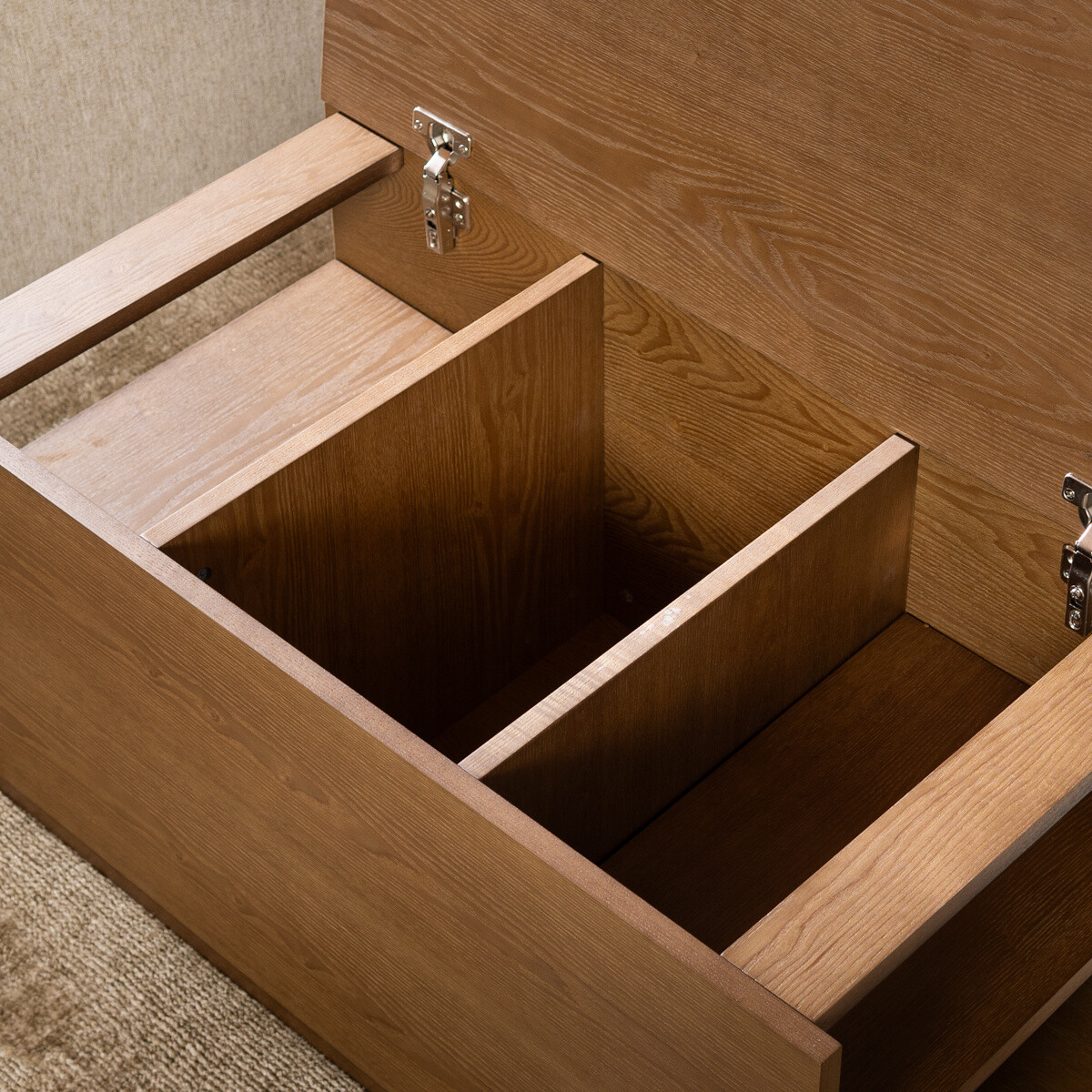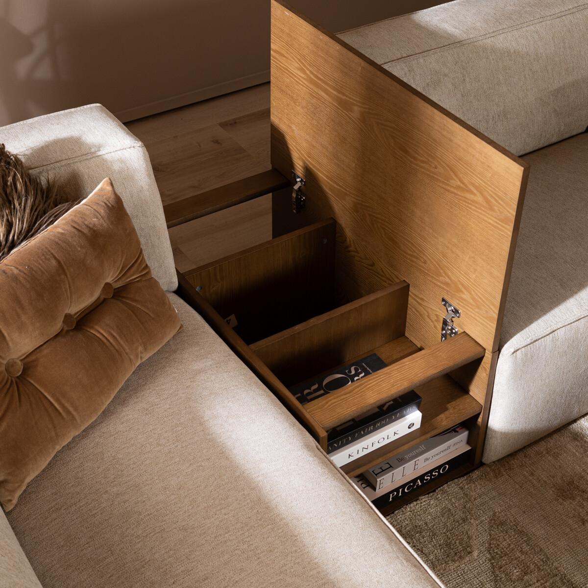 De sidetable is gemaakt van MDF met een eikenfineer laag. MDF is een plaatmateriaal dat wordt gemaakt door houtvezels onder hoge druk samen te persen met behulp van een lijm of hars. Het materiaal wordt vervolgens verwarmd en samengeperst tot een dichte, stevige plaat. De laag eikenfineer waarmee het meubel is afgewerkt, geeft de bank tafel een robuuste uitstraling. Eikenfineer is niet van massief hout te onderscheiden en trekt niet tot nauwelijks krom. Dankzij het softclose-systeem sluit de deksel van de Jaxx soepel en stil. Daarnaast blijft de deksel stevig op zijn plaats staan wanneer je hem open laat, voor extra gebruiksgemak.