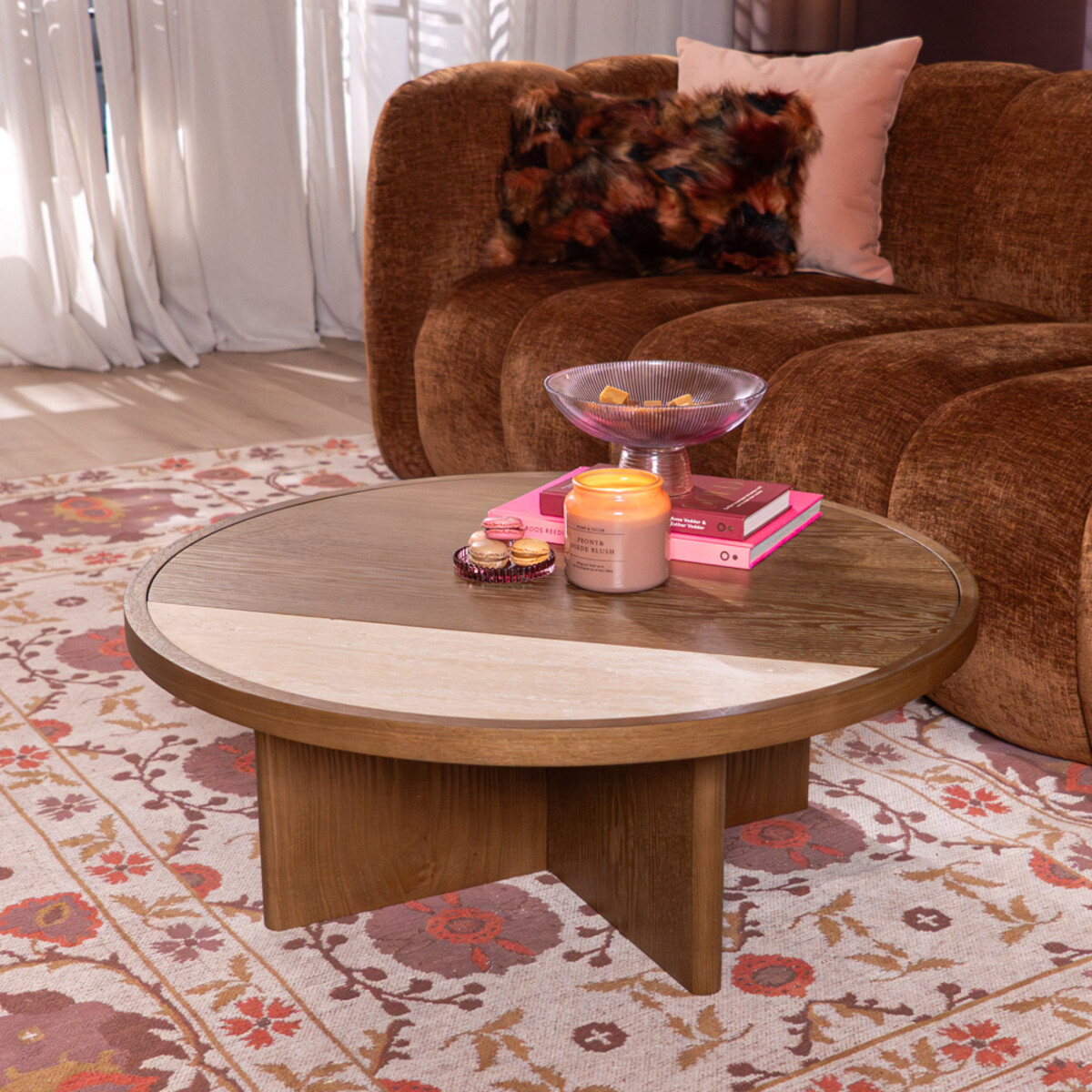 Salontafel Maeva is een stijlvol middelpunt voor elke woonkamer. Met haar ronde vorm van Ø80 cm en het opvallende contrast tussen eikenhout en een ingelegd travertin detail, brengt Maeva een perfecte balans tussen elegantie en natuurlijke materialen.