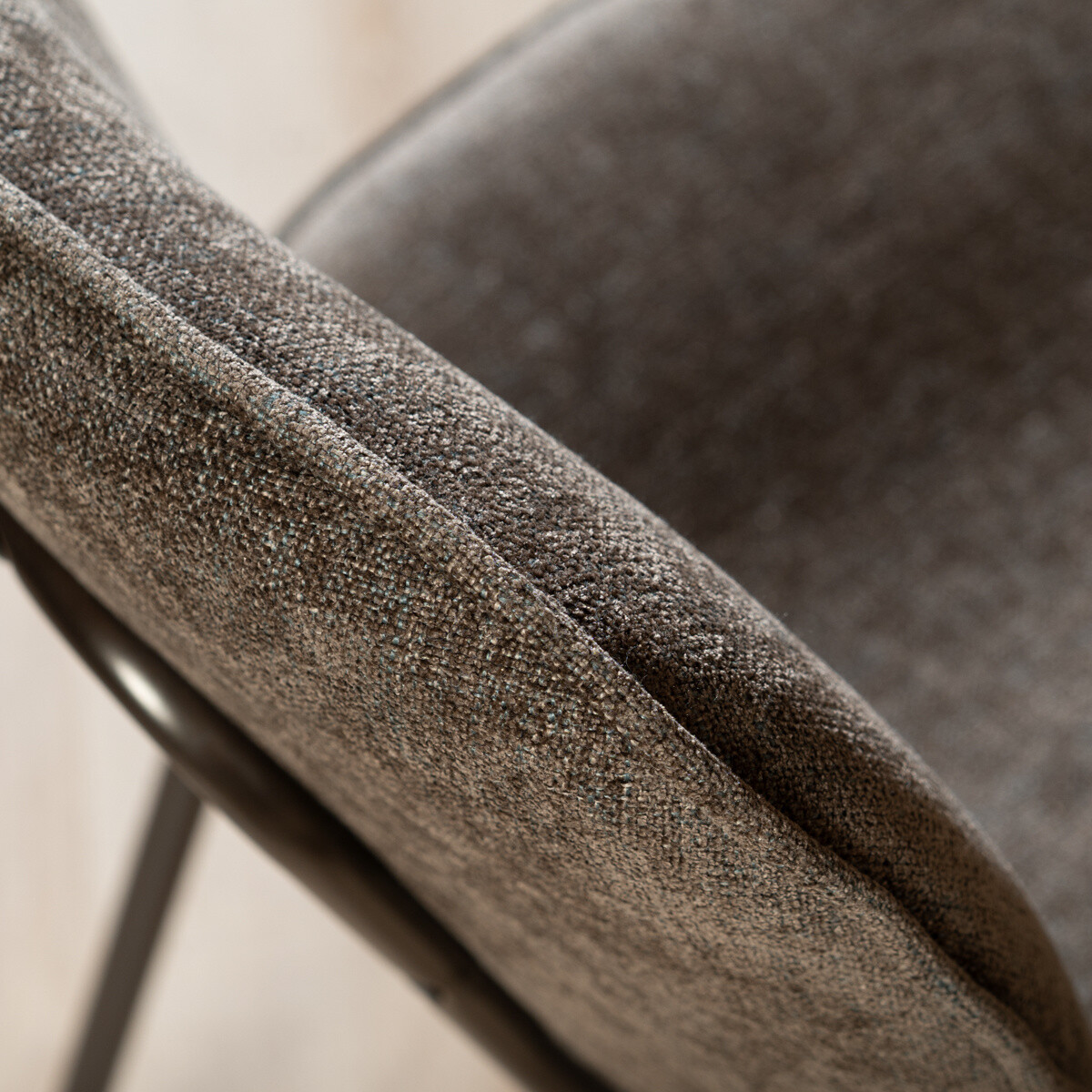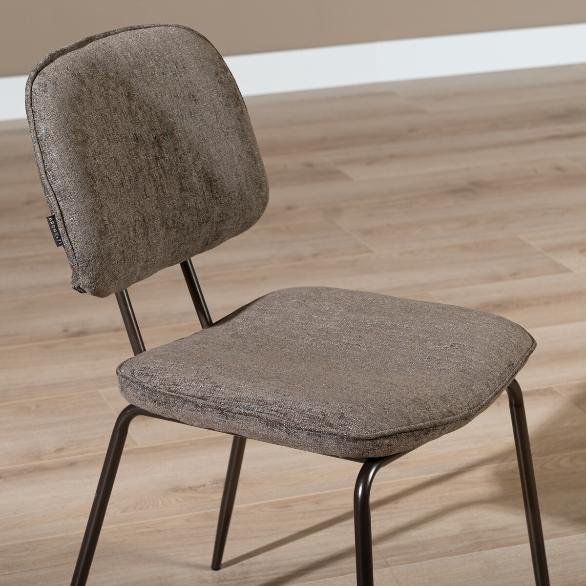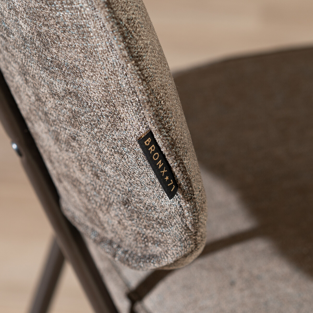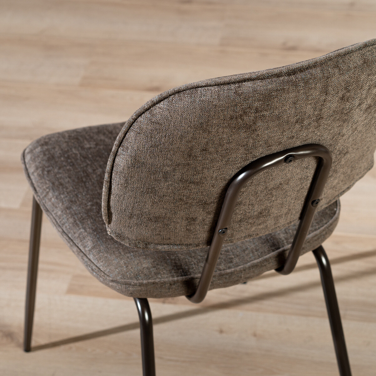 Eetkamerstoel Javi is de perfecte eetkamerstoel als je een minimalistisch design zoekt, maar ook nog comfortabel wil zitten. Door het donkerbruine stalen frame met glanzende finish in combinatie met de zachte velvet stof heeft de stoel een exclusieve, stijlvolle uitstraling die past binnen de trendy Urban Loft stijl. De stoel heeft een industrieel karakter, maar de combinatie van de velvet stof met subtiele glans en het donkerbruine frame maakt de stoel een echt statement aan de eettafel.